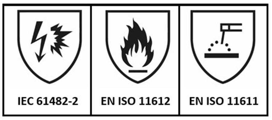 | Normen Kleidung: | EN 1149-5, IEC 61482 Klasse 2, EN ISO 11611, EN ISO 11612 |