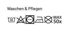 | Reinigung/Wäsche: | Industriewäsche geeignet, Maschinenwäsche 60°C, Trockner geeignet, Bügeln bei mittlerer Temperatur | Stufe 2 |