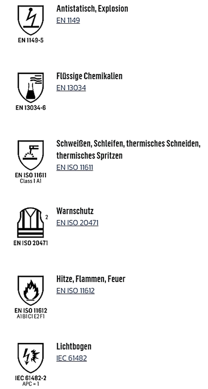 | Normen Kleidung: | EN 1149-5, EN 13034-6, IEC 61482 Klasse 1, EN ISO 11611 Klasse 1 A1, EN ISO 20471 Klasse 2, EN ISO 11612 A1B1C1E2F1 |