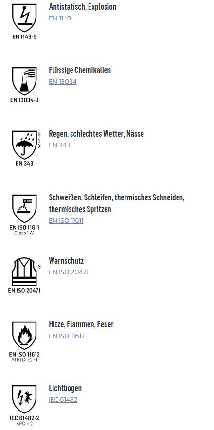 | Normen Kleidung: | EN 1149-5, ATEX, EN 13034-6, EN ISO 11611 Klasse 1 A1, IEC 61482 Klasse 2, EN 343 x3 y2, EN ISO 11612 A1B1C1E1F1, EN ISO 20471 Klasse 3 |