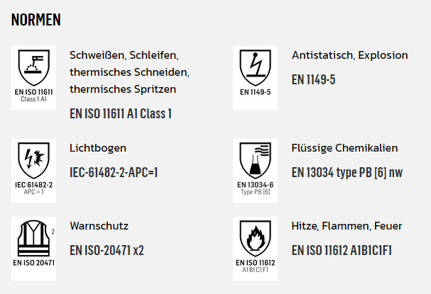 | Normen Kleidung: | EN 1149-5, ATEX, EN 13034-6, IEC 61482 Klasse 1, EN ISO 20471 Klasse 2, EN ISO 11611, EN ISO 11612 |
