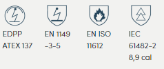 Normen Kleidung: EN 1149-5, ATEX, IEC 61482 Klasse 1, EN ISO 11612