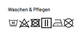 | Reinigung/Wäsche: | Bügeln bei niedriger Temperatur | Stufe 1, Maschinenwäsche 40°C |