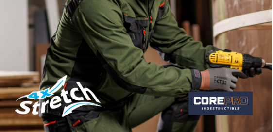 Strapazierfähiges Poly-Cotton-Canvas-Gewebe, Stretcheinsätze aus 4-Wege-Stretchgewebe, 3-fach Nähte und innovative Designmerkmale bieten hervorragenden Komfort und Flexibilität.